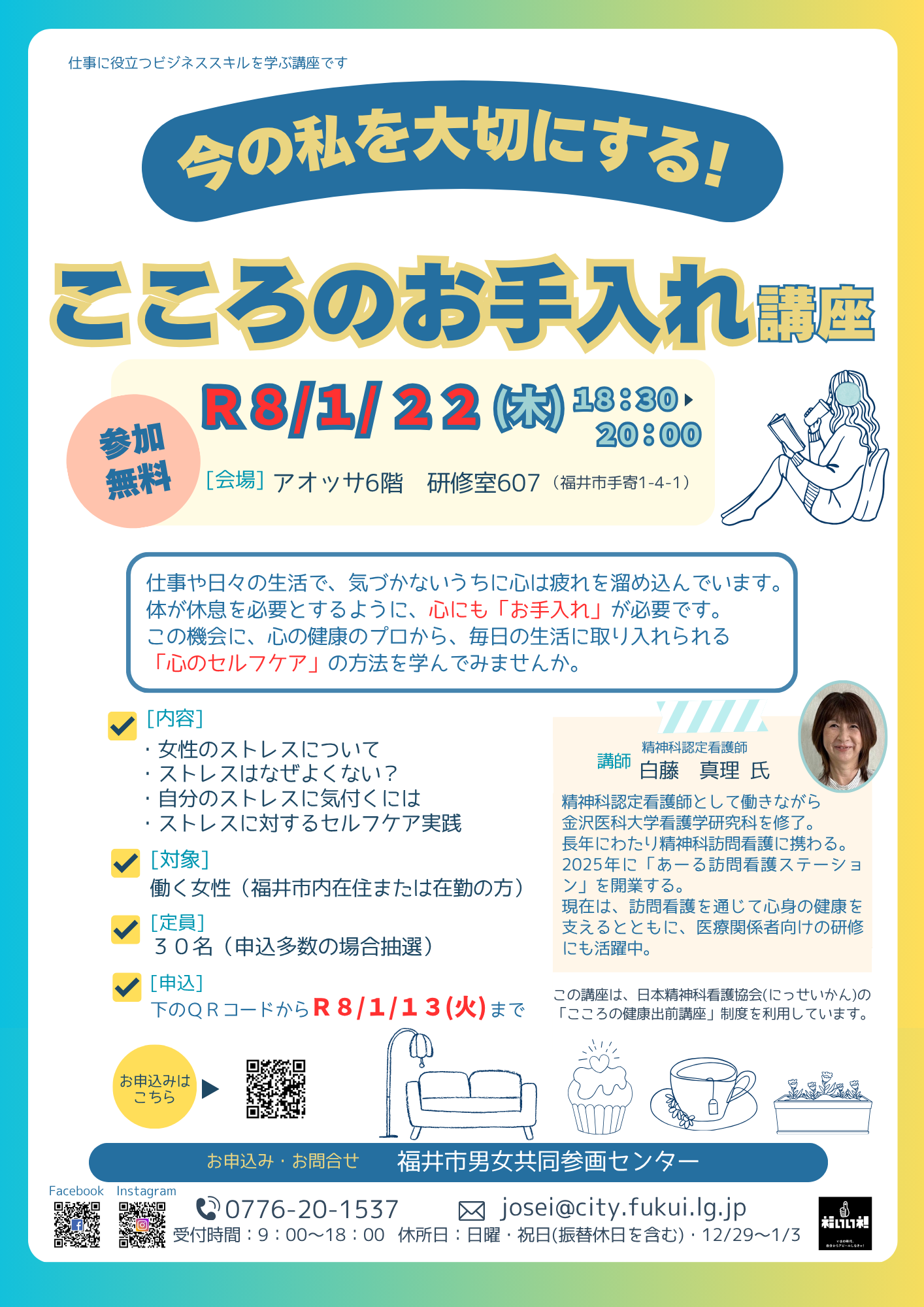 備考 ■仕事をしていくうえで大切な「こころの健康」を維持するために、日常生活に取り入れやすい「こころのお手入れ」方法をレッスンします。■申込:令和8年1月13日(火)までにチラシQRコード(福井市HP)から申込