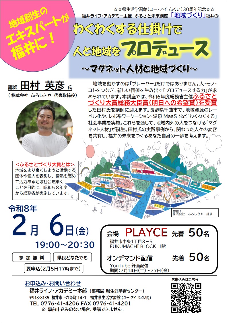 地域を動かすには、人・モノ・コトをつなぎ新しい価値を生む「プロデュース力」が不可欠。本講座では、ふるさとづくり大賞総務大臣賞受賞の田村氏が講師。長野県千曲市でワーケーションや温泉MaaSなど革新的事業を展開し、地域内外を結ぶ「マグネット人材」を創出。実践事例を通じ、人々の変化を共有し、福井の未来を築く一歩を考えましょう