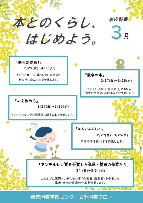 ■(1) 一 般「新生活応援!」 ■(2) 一 般「数字の本」 ■(3) 一 般「心を休める」 ■(4) 子ども「はるのあしおと」 ■(5) 子ども「アンデルセン賞を受賞した北米・南米の作家たち」